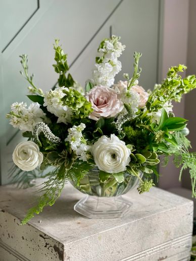 A fuller, well-balanced centerpiece with a mix of seasonal blooms, ideal for reception tables.